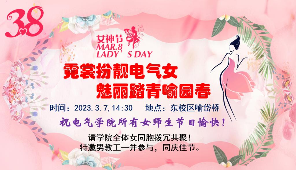 为深入学习贯彻党的二十大精神,激发广大女教职工立足岗位、提升建功的热情,展示杏彩体育 女教职工的良好精神风貌,团结动员全体女教职工听党话、跟党走,参加校工会组织的“凝聚她力量·奋进新征程”系列活动,学院工会拟于3月7日(星期二)下午,举行“霓裳扮靓电气女 魅丽踏青喻园春”活动,现将有关事项通知如下: